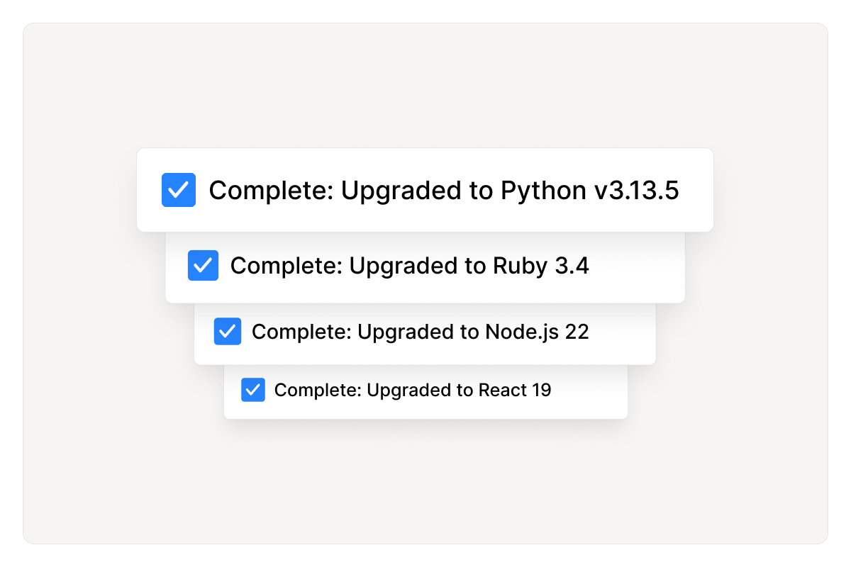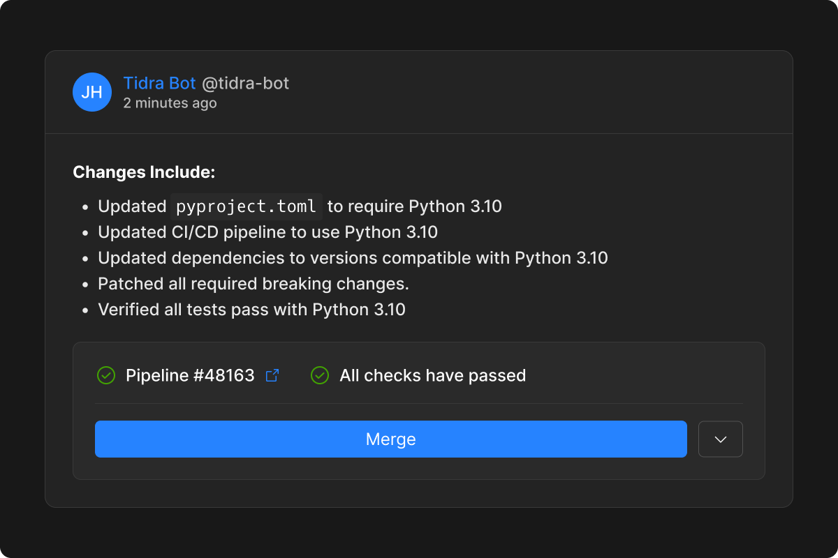 Keep your code modern and compliant. Tidra AI automates major language version upgrades, safely handling breaking changes so you stay ahead of the curve.